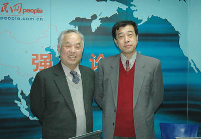 2005年1月5日,中國國際問題研究所研究員郭震遠(左),北京大學國際關系學院國際政治系主任李義虎(右)接受媒體訪談,回顧和分析2005年兩岸關系中的熱點。(圖片來源:人民網)