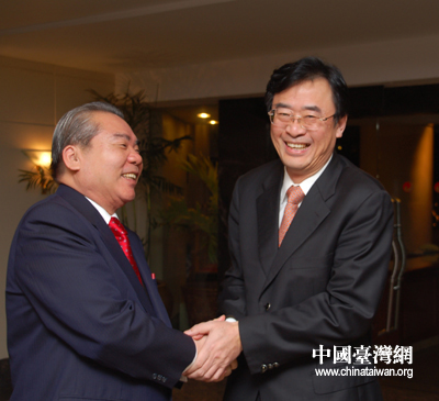 第三屆“中國和平統一亞洲論壇”于19日在菲律賓首都馬尼拉召開,前一天晚上來自兩岸四地的反“獨”促統人士云集會議駐地,其中很多人都是多年的好朋友。圖為中國和平統一促進會執行副秘書長李路(右)與臺灣海峽兩岸和平統一促進會會長郭俊次相談甚歡!。ㄌ镌迄i 攝)
