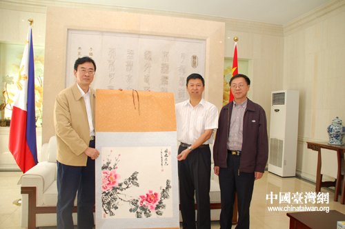 1月19日,第三屆“中國和平統(tǒng)一亞洲論壇”在馬尼拉圓滿閉幕。翌日(20日),中國統(tǒng)促會執(zhí)行副秘書長李路、副秘書長傅鐵生應(yīng)邀前往中國駐菲大使館,與中國駐菲律賓特命全權(quán)大使宋濤進(jìn)行座談,并向宋濤大使贈送精美禮品。 (田云鵬 攝)