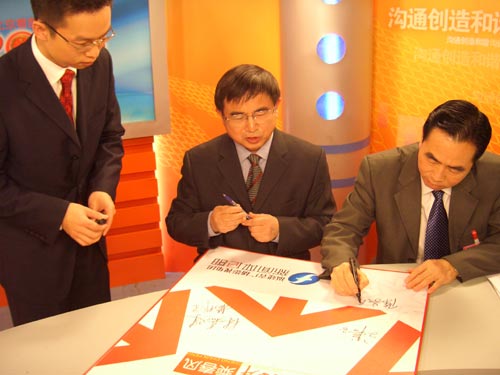 楊邦杰、陳家驊為《海峽西岸乘春風》節目簽字留念。