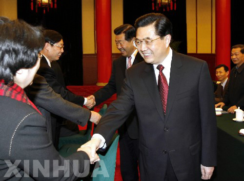3月4日,中共中央總書記、國家主席、中央軍委主席胡錦濤看望了出席全國政協十屆四次會議的民盟、民進聯組委員,聽取了委員們的意見和建議,并發表了重要講話。中共中央政治局常委、全國政協主席賈慶林一同參加看望。 新華社記者 蘭紅光 攝