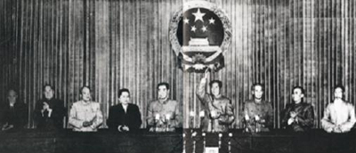 1954年9月15日至28日,第一屆全國人民代表大會第一次會議在京召開,大會通過了《中華人民共和國憲法》。圖為大會主席臺。左起:陳叔通、黃炎培、李濟深、宋慶齡、周恩來、毛澤東、劉少奇、郭沫若、張瀾。
