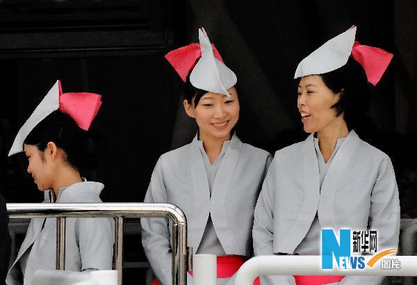 4月24日,日本館的幾位女工作人員在入口處準備迎接游客。新華社記者王頌攝
