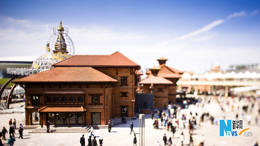 尼泊爾館以大型佛塔為主體,周圍環繞數個代表不同歷史時期的尼泊爾民間房舍,展現尼泊爾工匠杰出的建筑和藝術才華(4月24日攝)。新華社記者劉彬攝