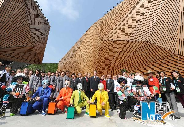 5月1日,參加加拿大館開館儀式的嘉賓向游客揮手致意。當日上午9時,位于上海世博園C片區的加拿大館舉行開館儀式。 新華社記者王頌攝