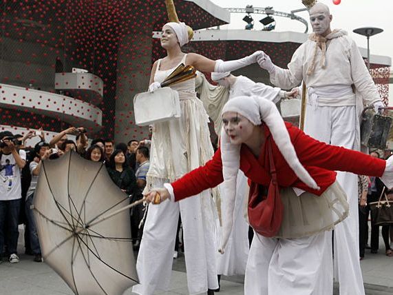 精彩紛呈的世博會,吸引了八方游客前來觀展。穿梭在展館之間的行為藝術表演,也是觀眾不容錯過的節目。更有觀眾自發上陣,支持世博,堪稱一絕。圖為在德國館前,行為藝術表演者吸引眾多觀眾駐足觀賞。(記者 劉歆/攝)