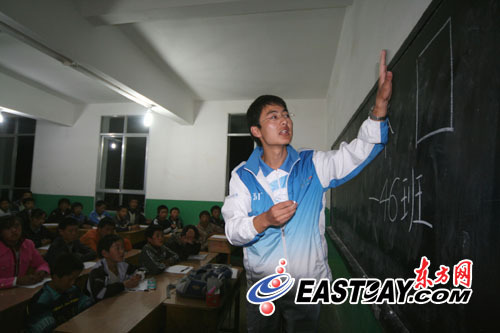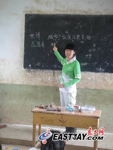 志愿者帶去了自費(fèi)4000多元買的文具,看到一位孩子,就給他一份。支教的同學(xué)大部分也是世博志愿者。在課堂上,他們教授語文、音樂、禮儀、世博、英語、手工等10門課。在世博課上,他們告訴孩子世博會(huì)背景,介紹世博會(huì)熱門場(chǎng)館,為了給孩子們更直觀的感受,他們用筆記本電腦,通過圖片和視頻向他們演示。馬澤在上課的時(shí)候,讓學(xué)生們大聲地喊出世博會(huì)口號(hào),他說:“這些孩子的情感一直都被壓抑著,我讓他們大聲喊出來,把壓抑釋放出來!敝驹刚呱险n的教室門外邊總是站滿了村民。
