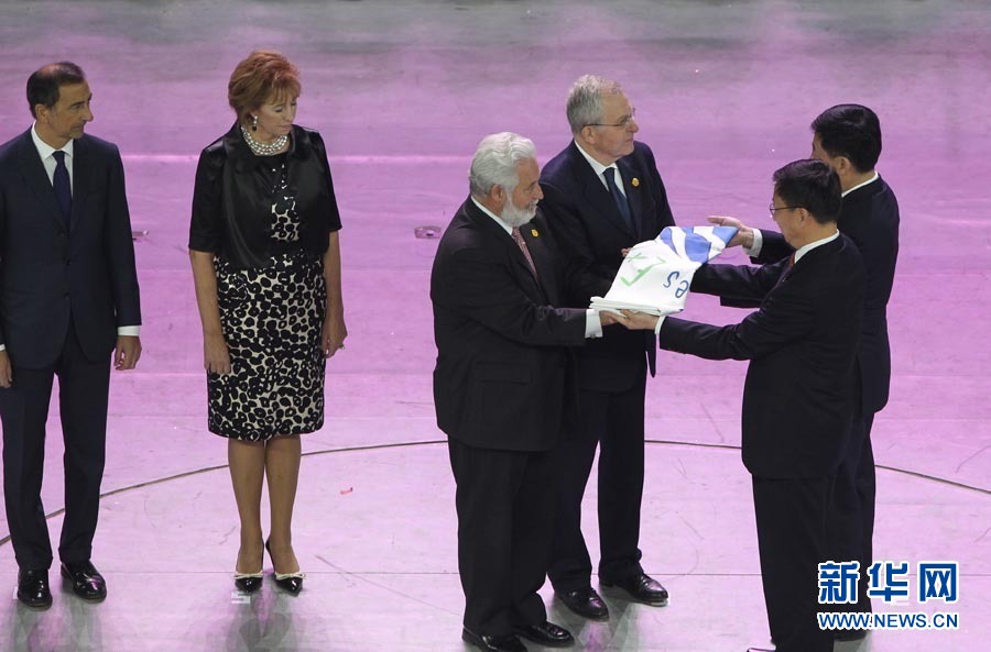 10月31日,中國2010年上海世博會閉幕式在世博文化中心舉行。這是世界展覽局旗交接儀式。 新華社記者凡軍攝