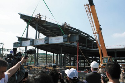 昨天,上海世博會美國館建設工程鋼結構封頂