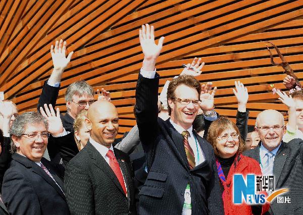 5月1日,參加加拿大館開館儀式的嘉賓向游客揮手致意。當日上午9時,位于上海世博園C片區(qū)的加拿大館舉行開館儀式。 新華社記者王頌攝