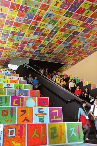 韓國館是用文字建筑起來的場館。本報記者王磊攝