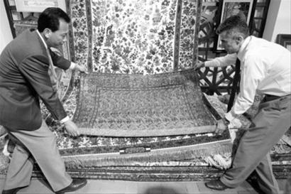 這僅是Sabery“壓箱底”寶貝中的一塊。在記者的堅持下,Sabery從角落里翻出一只木箱,小心翼翼地打開后,又拉開罩在上面的布包,記者這才看到一塊非常古樸精致的地毯。這塊地毯上的圖案都是規(guī)則的幾何形狀,雖然有著200年以上的歷史,圖案依然鮮明清晰,沒有任何損害。Sabery告訴記者,從這塊地毯的做工來看,它以前一定屬于某個貴族,但究竟是誰,還無從考證。從地毯上的簽名來看,它應(yīng)該是伊朗卡山地區(qū)一位叫做阿赫巴巴也(音譯)的地毯世家制作,內(nèi)行一看便知是極品中的極品,而它的價值至少也在700萬元以上。(陳文)