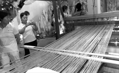 現場進行展示的馬達加斯加美女名叫Bodo,記者見到她時她正在趕織一條披肩,已完成了半米多長。Bodo使用的是有梭木質織布機,看上去并不很新,但她的技藝很熟練。