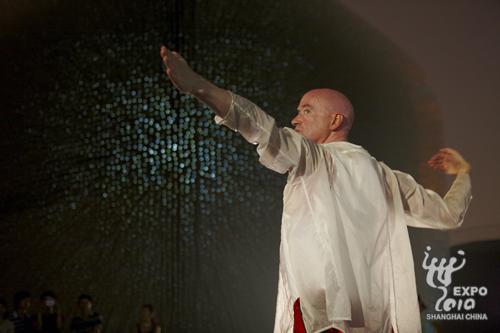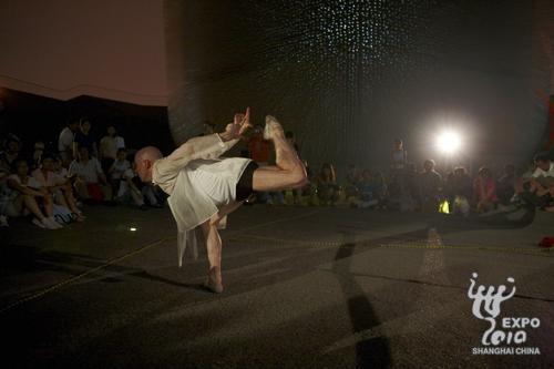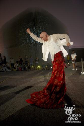 5日晚上,英國(guó)藝術(shù)家艾倫·格瑞格(Alan Greig)在“種子圣殿”前展現(xiàn)了精彩絕倫的蘇格蘭現(xiàn)代舞蹈藝術(shù)。艾倫 格瑞格是X Factor舞團(tuán)的藝術(shù)總監(jiān),他的舞蹈作品集運(yùn)動(dòng)、刺激與娛樂(lè)性于一體,此次演出片段是根據(jù)他在2009年上海舞蹈節(jié)中首演的獨(dú)舞《Into the Light》改編而成。