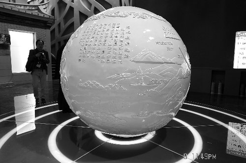 世博會(huì)福建館的第二展區(qū)為互動(dòng)區(qū)。展區(qū)中有三個(gè)直徑兩米的大圓球,分別用福建特色的脫胎漆器、德化白瓷和漆線雕工藝制作。