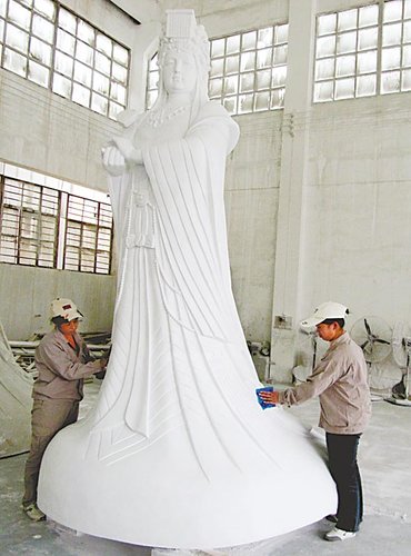漢白玉媽祖雕像 由媽祖故鄉(xiāng)莆田市政府專門(mén)為世博會(huì)定制,采用緬甸純漢白玉制作,高3.23米,是目前國(guó)內(nèi)最大的漢白玉媽祖雕像。