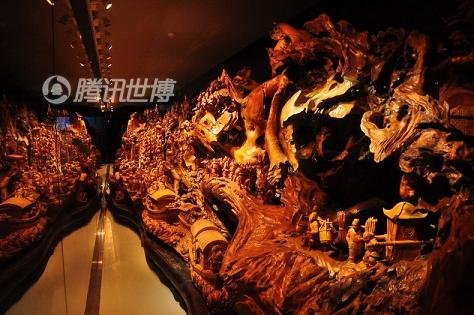 地下藏寶室的另一亮點,是這里展出的18米長,12噸重,2.56米高的巨型根雕《清明上河圖》,近800個不同儀表、不同舉止、不同神情的人物被刻畫得栩栩如生。講解員說,根雕原料是從東南亞進口的一整棵香樟古木,有2300年的樹齡,“35位藝術家和工匠用了5年時間創作而成,北京一家評估公司認為它的價值大約為5.6億元。”