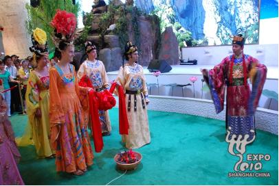 據(jù)悉,此次活動(dòng)是陜西館開館以來(lái)舉辦的最大規(guī)模的一次文化活動(dòng),以陜西館形象大使“唐明皇”、“楊貴妃”與陜西華清池《長(zhǎng)恨歌》藝術(shù)團(tuán)的表演及各種互動(dòng)游戲?yàn)橹饕问剑_展大唐婚典、愛(ài)的郵遞、明皇賜印、七夕盟誓、投壺比賽等體驗(yàn)活動(dòng),為游客留下歡快、愉悅的美好記憶。(世博網(wǎng))