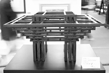思路明確后,他開始操作。首先,在電腦里用3D建模,計算出需要258塊木頭、31種構件、9種不同的榫卯結構,可以以10毫米×10毫米的粗細,截取10毫米至518毫米的木材,構建成最寬處約半米的紅木中國館玩具。隨后,就進入木工階段——全中國有能力接下這個木工活兒的人可謂鳳毛麟角。導師杭侃把這個方案推薦給了艾未未旗下的工作坊。最后,兩名老師傅花了兩個月制作了兩個,成功了一個。因為趕時間送作品,趙獻超只趕上包裝前掂量了一下木條——木條就好比宜家家具一樣分拆成條狀,包裝后運往上海,落地后再搭建的。