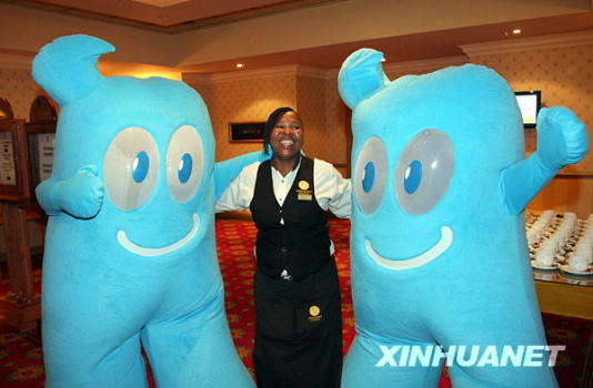 1月21日,在南非首都約翰內斯堡,幾名當地青年與上海世博會吉祥物“海寶”合影。新華社發(梁銓攝)