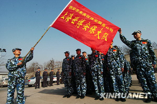 當日,2010年上海世博會從西安挑選的首批56名保安從西安出發,前往上海執行世博會安保任務,他們將在上海工作8個月。據介紹,上海世博會共挑選西安保安300余名。新華社記者 陳昌奇 攝