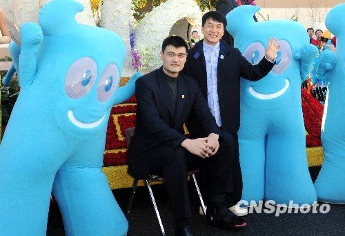 當(dāng)?shù)貢r(shí)間十二月三十一日,剛剛完工的上海世博會(huì)花車接受美國(guó)帕薩迪納玫瑰花車委員會(huì)的評(píng)審,NBA中國(guó)球星姚明和香港影星成龍抵達(dá)現(xiàn)場(chǎng)為上海世博會(huì)花車助陣。 中新社發(fā) 張煒 攝