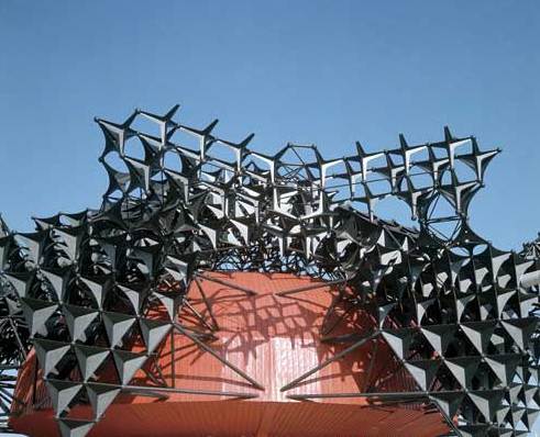 東芝公司場館由1500個四方形的金屬單元圍繞而成,代表“未來的森林”之意。