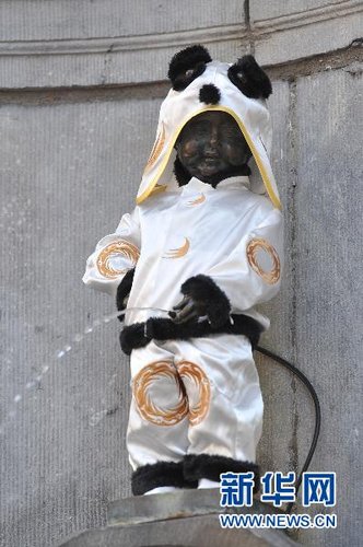 6月5日,比利時首都布魯塞爾著名的小尿童穿上了熊貓服。 當(dāng)天,小尿童穿上了由中國四川省成都市贈送的熊貓服。在6月7日上海世博會成都館日上,比利時館的小尿童復(fù)制品也將穿上一件熊貓服。 新華社記者 武巍 攝