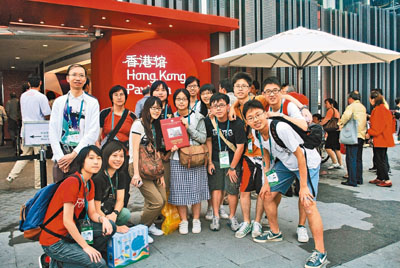 香港中華基金中學的11位中七生在世博園區內度過了精彩難忘的3個星期。圖為他們在香港館前的合影。