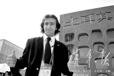 在土耳其館里有一個始終忙碌著的小伙子,他時而出現在咖啡館里招待貴賓,時而在館外歡快地跳著民族舞,時而進行人員調度,又時而扮演新聞官、翻譯的角色。這位1984年出生的土耳其小伙給自己取了一個“挺括”的中文名字——趙忠海,當記者笑言他簡直就是萬金油時,他若有所思地點了點頭,“又學了一個新詞,哈哈。”