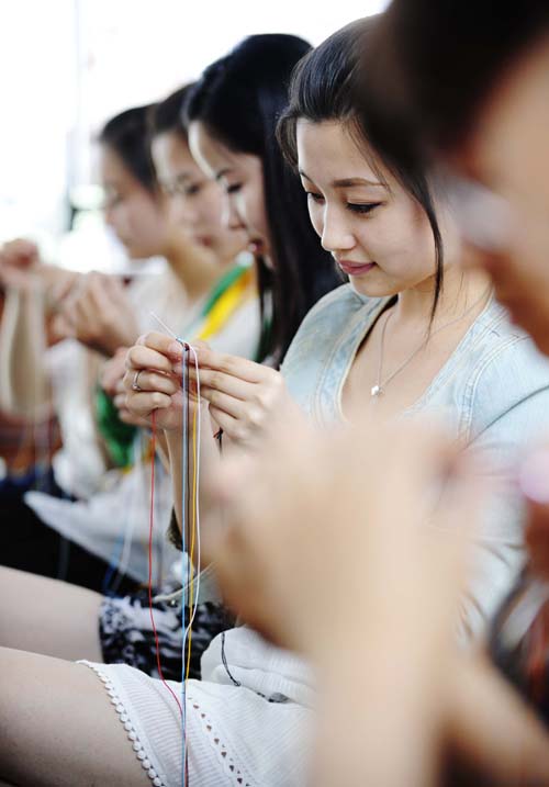 6月16日,幾位女孩在中國元素云錦小課堂學習編織五彩繩。當日是端午佳節,世博園寶鋼大舞臺的中國元素活動區舉行了一系列民俗體驗活動迎接端午節。游客們在這里體驗包“茶粽”、編彩繩、為巨龍圖著色等端午特色活動,過了一個快樂的節日。新華社記者 王建威 攝