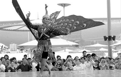 昨天,柬埔寨演員在園區亞洲廣場表演孔雀舞,吸引游客駐足觀賞。(張海峰 攝)
