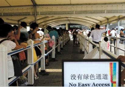 和沙特館一樣,英國(guó)館也嚴(yán)格采用了世博局的新綠色通道標(biāo)準(zhǔn)。昨天下午2點(diǎn)30分左右,記者在現(xiàn)場(chǎng)看到,一對(duì)聾啞夫婦在英國(guó)館綠色通道處向工作人員出示了殘疾證,但被工作人員婉拒。工作人員還示意這對(duì)夫婦觀看旁邊新修改的綠色通道提示牌,只見上面注明只有三類人可以從綠色通道優(yōu)先進(jìn)入:1、坐在輪椅上的殘疾人;2、行動(dòng)不便的殘疾人;3、75歲以上的老人。由于無法提供身份證或老年證,一位老人也不得不遺憾地走向另一個(gè)展館。