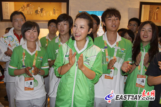 圖片說(shuō)明:5月18日,著名青年歌唱家譚晶在中國(guó)元素畫坊與志愿者共同演唱世博志愿者歌曲《世界》。