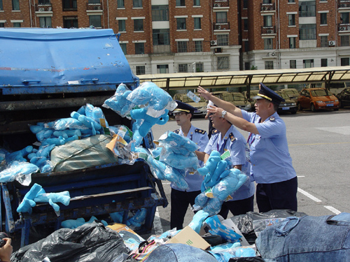 22日上午十時,上海世博局在局內廣場舉行“世博園區打擊整治‘三販’違法犯罪活動專項行動假冒世博特許商品首次集中銷毀儀式”。上海市政府副秘書長、上海世博局局長洪浩出席儀式并宣布將園區首批10萬余件假冒世博會特許商品集中銷毀。上海世博局黨委副書記、上海世博局副局長陳安杰,上海世博局副局長姚志榮等出席儀式。