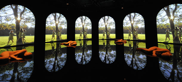 這是上海世博會意大利館內的“意大利花園:富有激情的建筑”展。通過多媒體影像技術,水中如鏡面般的投影和漂浮的雕塑,展現了不同形式的意大利古典和現代景觀建筑,營造如夢似幻的視覺體驗(9月9日攝)。新華社記者 藺以光 攝