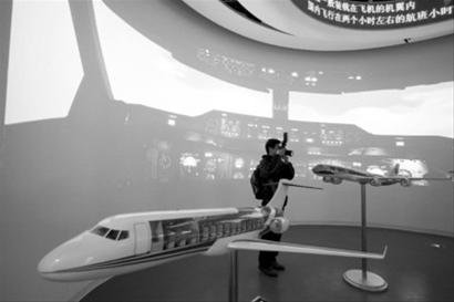 在中國航空館的等候大廳,擺放著各種未來客機模型。據介紹,飛翼客機與現有客機最大的不同是沒有機身和機翼的明顯區分,而是將寬大的機體和后掠的機翼完美融合在一起。與常規設計相比,這樣的設計使整個飛機機體都能產生升力,同時還能降低阻力,因此有望減少30%以上的燃料消耗。此外,飛翼客機獨特的外形使它在傾斜轉彎時更為平穩,乘客不易產生暈機反應。除了這個模型外,飛翼外形的概念客機在航空館中還多次出現。