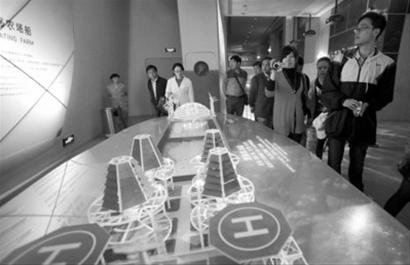 □中國船舶館(網上船舶館)展示的“海上農場”模型,它采用風能供電,人們能在甲板上開辟出的“土地”上種植各種蔬菜等。新華社圖片