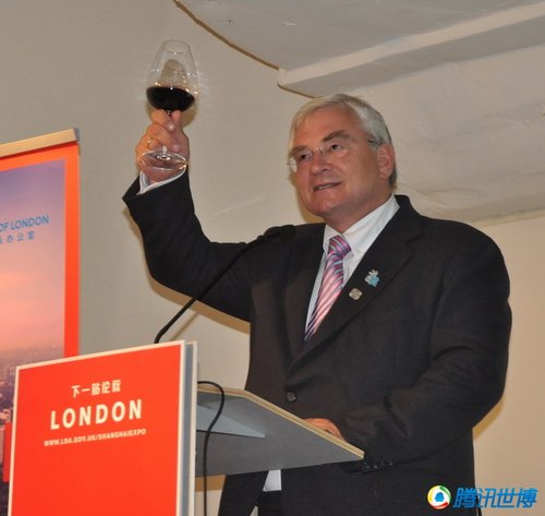 2010年7月27日晚,上海世博會英國館(網上英國館)內,倫敦市副市長理查德-巴恩斯為慶祝奧運會倒計時舉杯