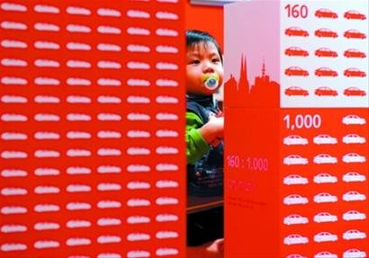 □不來梅館內(nèi),一名小觀眾在看通過“拼車”實(shí)現(xiàn)“160輛汽車可取代1000輛汽車”功效的展板。新華社圖片