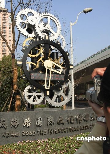 3月26日,亮相上海街頭的上海世博會倒計時鐘吸引不少路人的關注。這座倒計時鐘高5米、寬2.5米,由一組直徑0.8至2.4米、環環相扣的齒輪組成,整體結構粗獷有力,極具藝術動感。 中新社發 湯彥俊 攝