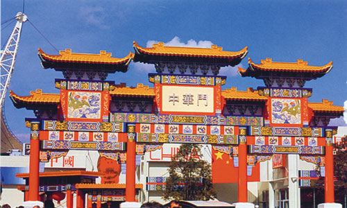 當(dāng)時(shí)的中國館是由布里斯班世博會(huì)主辦方為我國提供的已建成的、獨(dú)立的占地1822平方米的國際館。為了醒目標(biāo)識(shí)中國館的位置,我們?cè)瓟M在正門入口處搭建一座極其精美的大型牌樓。后來應(yīng)主辦方的建議,我們改變方案,將牌樓建在了離中國館和世博園區(qū)入口處都不遠(yuǎn)的主要道路中央,這也是世博會(huì)開幕后每次彩車游行的必經(jīng)之路。這不但突出了中國的參展,同時(shí)也為世博會(huì)創(chuàng)造了一處非常精彩完美的景觀,成為參觀者拍照留念的好地方。