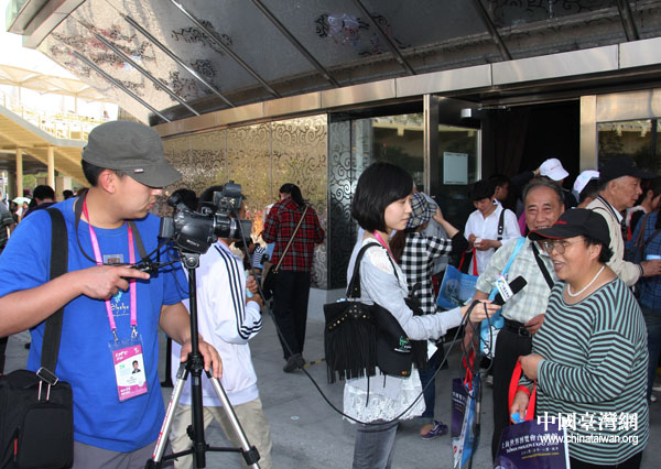 中國臺灣網記者在采訪參觀臺灣館的游客。(中國臺灣網 鐘寶華 攝)