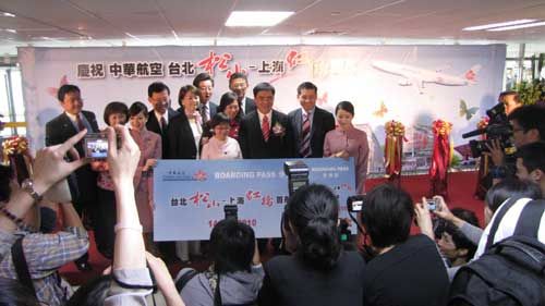 人民網臺北6月14日電 (記者吳亞明 徐蕾)今天上午8時45分,臺灣中華航空CI-201班機滿載著158位旅客,從臺北松山機場飛往上海虹橋機場,這標志著松山、虹橋航線正式開通。臺北市長郝龍斌率團隨機前往上海,參加世博臺北文化周活動。