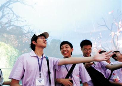 一組4人穿著同樣的T恤在世博園內(nèi)參觀,言語(yǔ)間還有臺(tái)灣口音,讓她們與其他游客略有不同,一些好奇的游客主動(dòng)走過(guò)來(lái)與她們攀談!澳銈兪桥_(tái)灣來(lái)的?”“是啊!薄笆菍W(xué)生嗎?什么學(xué)校的?”“我們是建國(guó)高中的!