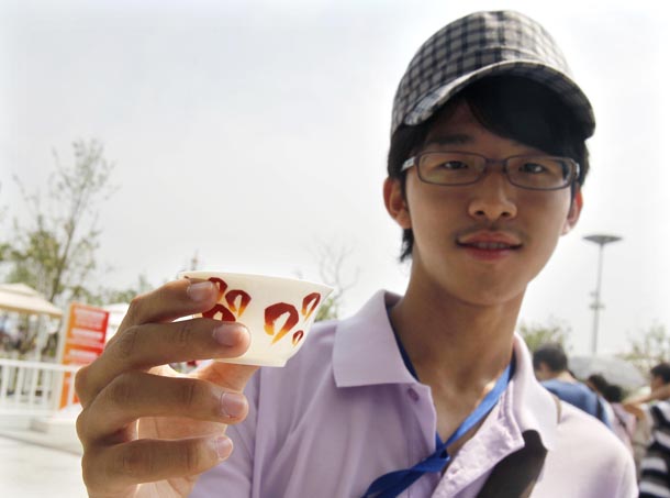 7月21日,臺灣成功高中的范鈞評手持世博會臺灣館贈送的小茶碗說:“這個帶回去作紀念,很贊”。新華社記者 劉穎 攝