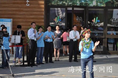 緊接著,在寶山教師放聲高歌下,以經(jīng)典的臺灣老歌帶出資源回收的重要性。隨后主持人更以活潑逗趣的把垃圾帶回家的互動游戲讓游客了解臺北市民每日垃圾分類及資源回收的狀況,逗得現(xiàn)場民眾笑聲連連、掌聲不斷。寶山教師們更是使出拿手絕活,帶領(lǐng)全體共跳廣場集體舞。最后,臺北館與寶山區(qū)教育局兩地代表互贈教師節(jié)禮物,臺北館贈送致贈臺北名產(chǎn)鳳梨酥、臺北國際花卉博覽會的邀請卡及花博一日劵二張,及臺北館贊助單位富士康科技集團(tuán)也致贈LED燈給寶山區(qū)教育局,寶山區(qū)教師也回贈寶山師生創(chuàng)作的“吹塑版畫”。
