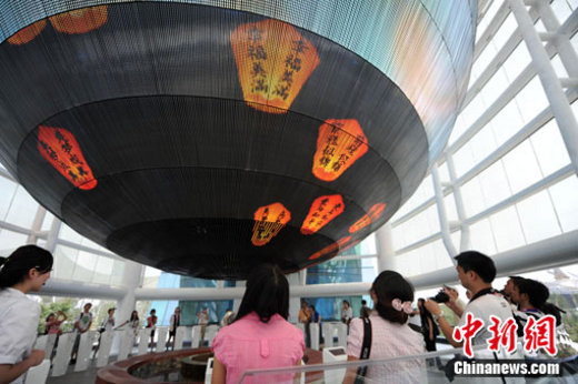 資料圖:圖為游客在臺灣館點燈水臺前許愿。