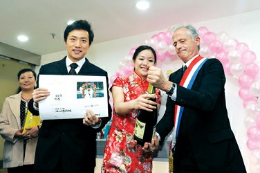 法國(guó)館總代表若澤·弗雷什向這對(duì)新人頒發(fā)了“浪漫婚典001號(hào)證書”。劉琛、朱麗萍與若澤·弗雷什、法國(guó)館吉祥物樂樂留影。若澤·弗雷什熱情擁抱新娘,祝福他們新婚快樂。