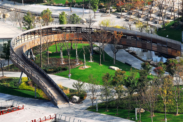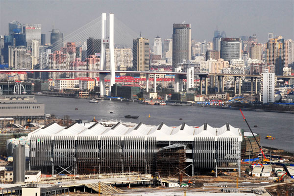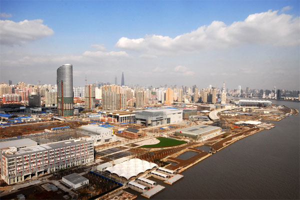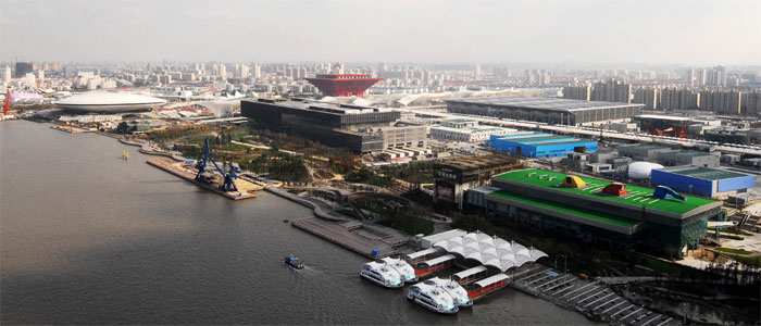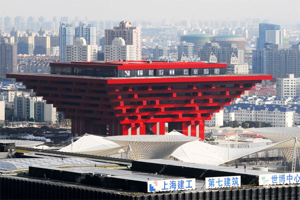 位于上海世博會浦東園區的世博標志建筑“一軸四館”全景。上海世博會浦西園區的世博場館全景。上海世博會浦東園區的世博公園。上海世博會浦東園區的非洲聯合館。